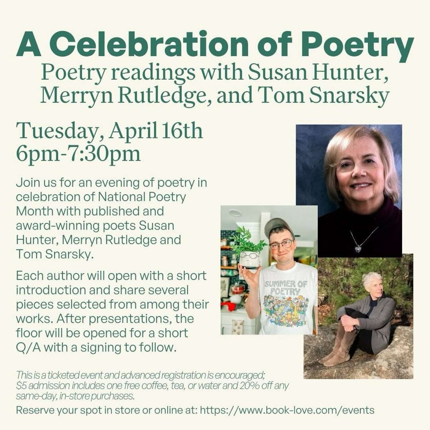 Join us for an evening of poetry in celebration of National Poetry Month with published and award-winning poets Susan Hunter, Merryn Rutledge and Tom Snarsky. Each author will begin with a short introduction and share about 15 minutes of their work. To end the evening the floor will be opened for a short Q/A with a signing to follow.
