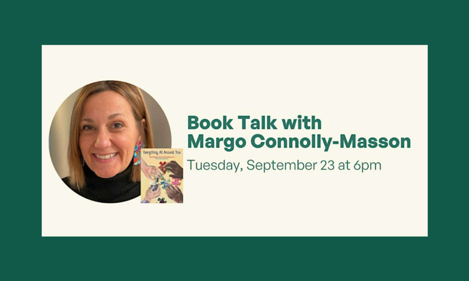 Join local author and illustrator, Margo Connolly-Masson, for a behind-the-scenes look at her newest children’s picture book, Everything, All Around, You. Margo will guide you through the creation of this beautiful and thoughtful book, from its start in Katie Mannix’s dining room, to its growth in a third grade classroom, to finding its home at Briley & Baxter Publications. Everything, All Around, You ties in many aspects of our local community, and it will be a treat to explore Margo’s thoughtful writing and illustrations. She will bring her original illustrations and drafts of the book, and will share photos and stories from her visits with local school children. This event will be engaging for adults and children.