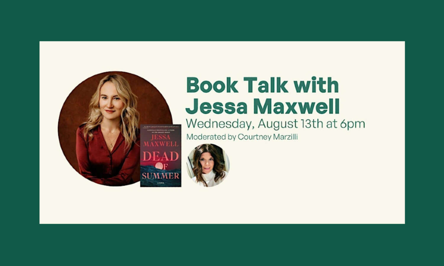 Join us for an evening of thrilling conversation as bestselling author Jessa Maxwell discusses her newest novel, Dead of Summer, in a special event moderated by book influencer and literary critic Courtney Marzilli.