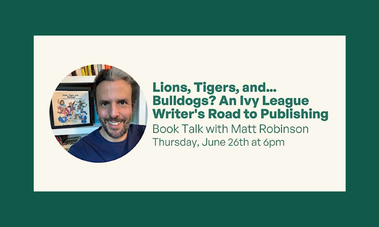 In this live presentation, professional writer and educator Matt Robinson will discuss his book, Lions, Tigers, and...Bulldogs? An unofficial guide to the legends and lore of the Ivy League(www.lionstigersbulldogs.com) and the surprising lessons he learned while writing it.