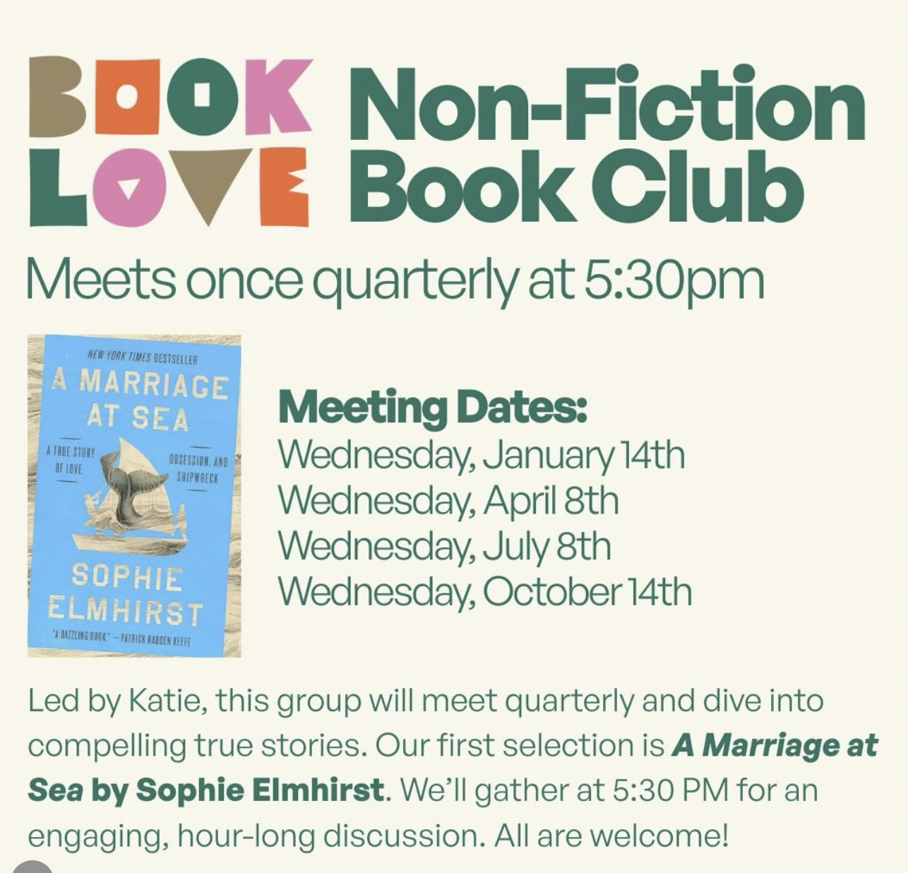Led by Katie, this group will meet quarterly and dive into compelling true stories. Our first selection is A Marriage at Sea by Sophie Elmhirst. We’ll gather at 5:30 PM for an engaging, hour-long discussion. All are welcome!