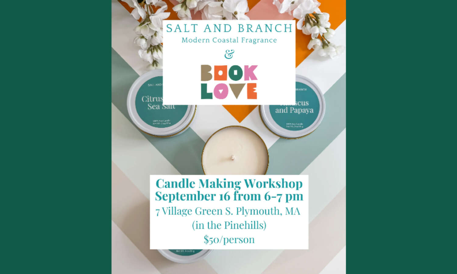 Join Book Love and Salt and Branch for an evening of candle making at Book Love on September 16 from 6-7 pm. Book Love is an independent bookstore and is located in the Pinehills, 7 Village Green S. Plymouth, MA.