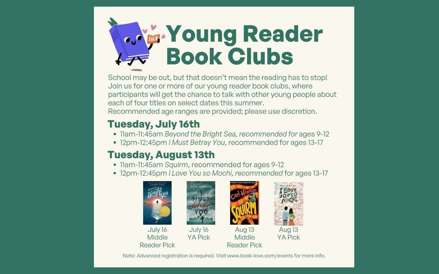School may be out, but that doesn’t mean the reading stops! Announcing Book Love's first ever young reader book club. We’ll be hosting two discussions per age group hosted by a local Plymouth teacher. Please come prepared to discuss the book detailed below. The $5 registration fee is inclusive of a drink, snack, and 20% off all purchases made that day.