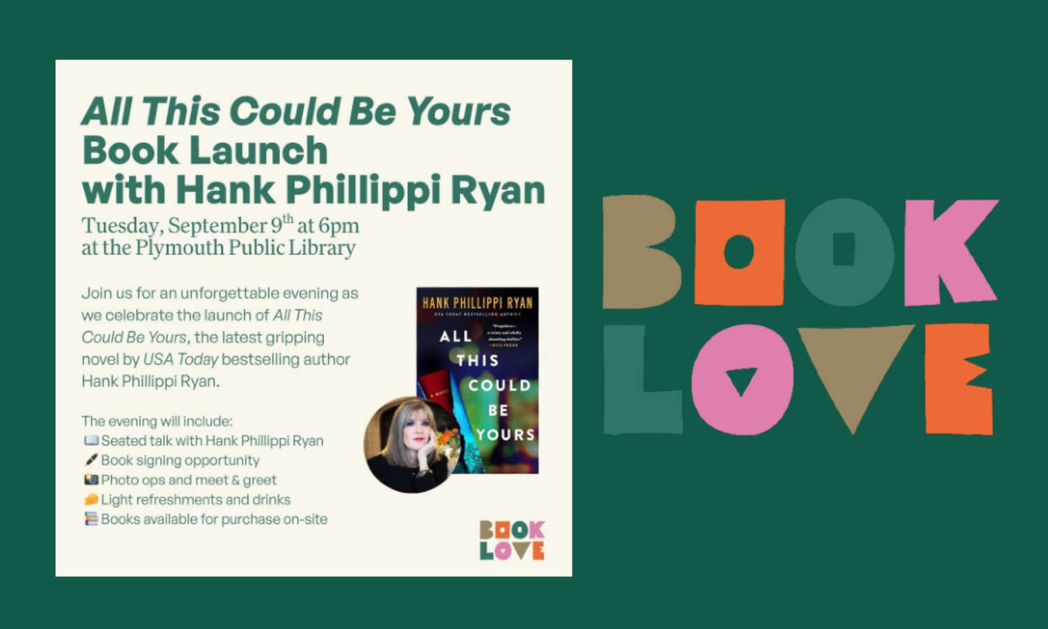 This unforgettable evening at the Plymouth Public Library celebrates the launch of All This Could Be Yours, the latest gripping novel by USA Today bestselling author Hank Phillippi Ryan.