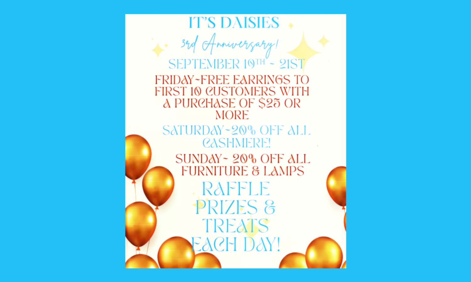 Join Daisies in celebrating three amazing years! There are special offers daily (Friday 9/19 is a complimentary pair of earrings for the first 10 customers who purchase $25 or more, thanks to Spartina 449 and East Wind Silver Co., Ltd.!)