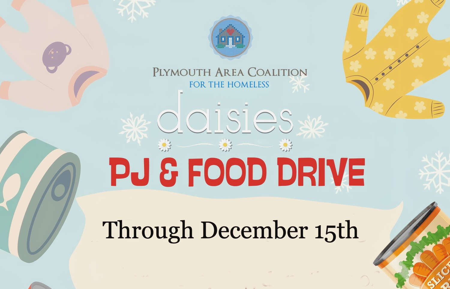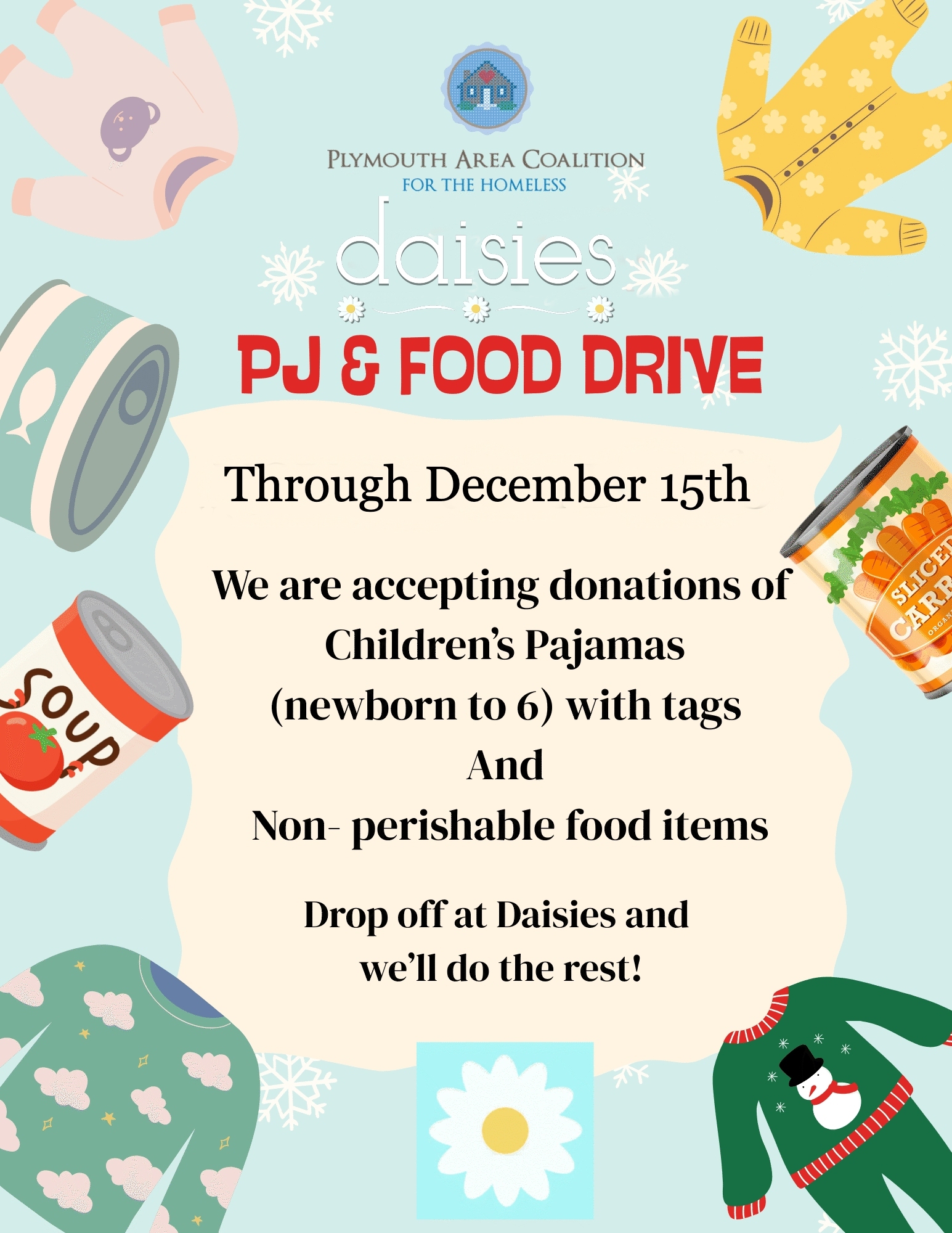 Daisies is excited to kick off their 3rd Annual Pajama & Food Drive in support of the Plymouth Area Coalition for the Homeless!