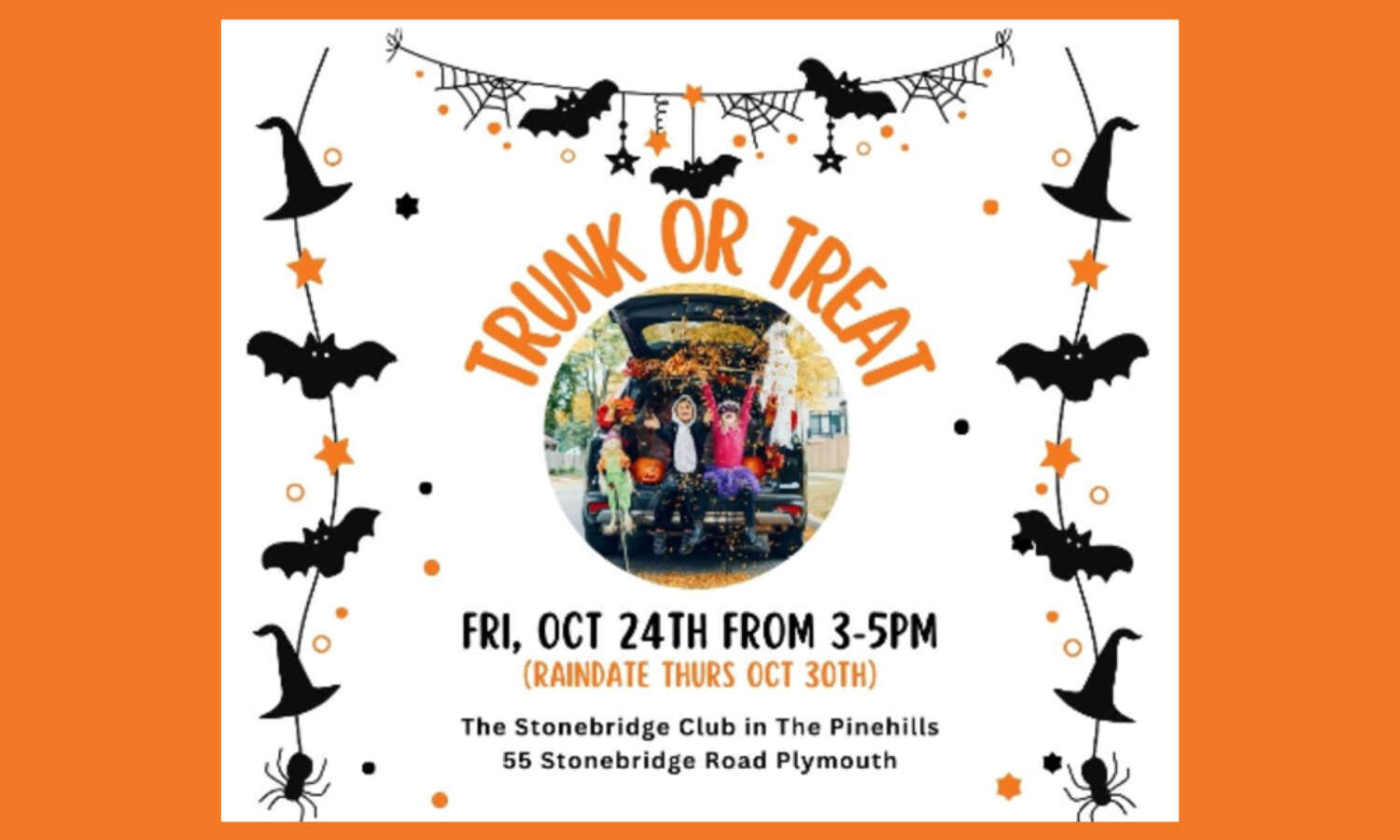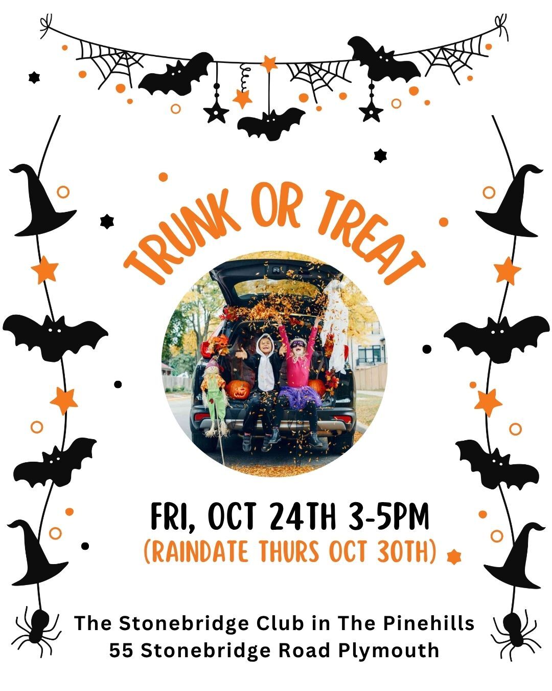 The Stonebridge Club is brewing up some Frightful fun with the 2nd Annual Trunk or Treat Event in the parking lot at 55 Stonebridge Road on Friday, October 24th from 3pm to 5pm and we would be THRILLed to have you there.